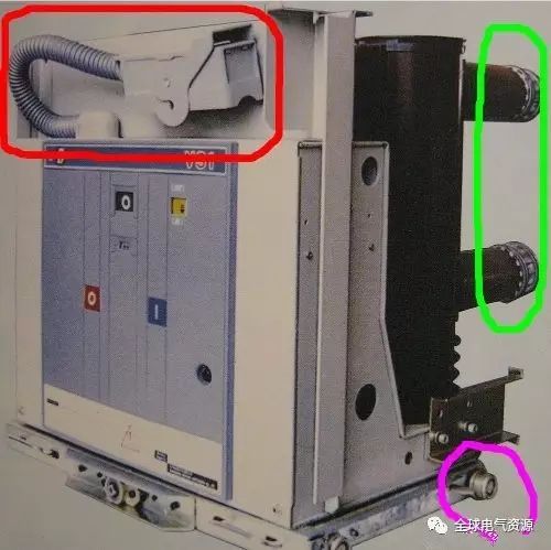 圖2顯示了VS1斷路器手車,它像抽屜一樣放置在開關(guān)柜位置。軌道上的滑輪在紫色的盒子里,二次連接插頭(處于未插好的狀態(tài))在紅色的盒子里,斷路器的動觸頭在綠色的盒子里。圖3中框架內(nèi)的設(shè)備與圖2中的相同,二次接線插頭處于插入位置。