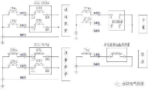 圖8顯示了電流回路,包括:保護、測量、計量和小電流接地線選擇。保護裝置和電能表安裝在開關(guān)柜上,所有接線均由開關(guān)廠連接。小電流接地選線裝置安裝在主控室,零序電流L401和N400需要通過控制電纜連接到該裝置。