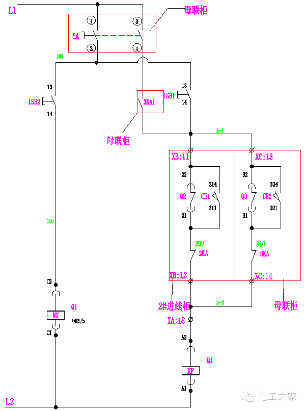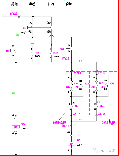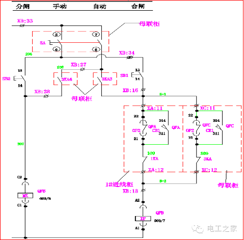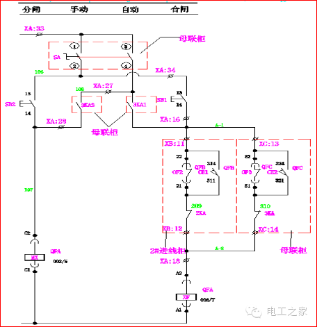 在手動(dòng)操作中:10,000轉(zhuǎn)SA的1和2條腿連接在一起。當(dāng)Q2和Q3閉合時(shí),Q1閉合回路A-2和A-3斷開(kāi),其閉合線圈XF不能通電,Q1不能滿足閉合條件。同樣,當(dāng)Q1、Q2或Q1、Q3同時(shí)接通時(shí),Q2或Q3也不能滿足切換條件。使進(jìn)線柜和母聯(lián)符合“三合一”的邏輯。
