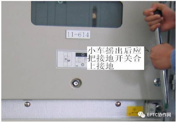 5.將接地開關的操作手柄插入中間門右下側的六角孔中,順時針旋轉使接地開關處于關閉位置。確認接地開關已經關閉后,打開機柜的下門,以便維護人員可以進入維護和檢修。