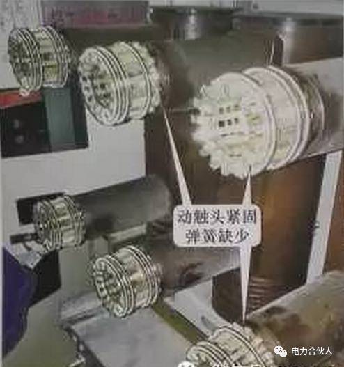經(jīng)專業(yè)人員檢查,確定母線室和后下柜無(wú)發(fā)熱開關(guān)柜,手車甲、乙相母線側(cè)動(dòng)、靜觸頭和甲相下動(dòng)、靜觸頭的觸頭部分發(fā)熱。開關(guān)柜電源故障檢查:將手車?yán)鰴C(jī)柜。發(fā)現(xiàn)一個(gè)壓縮彈簧在手車的a相母線側(cè)(上部)上的移動(dòng)觸點(diǎn)的端部缺失,并且一個(gè)壓縮彈簧在手車的a相母線側(cè)上的下移動(dòng)觸點(diǎn)的導(dǎo)電桿和b相母線側(cè)上的移動(dòng)觸點(diǎn)的絕緣外殼側(cè)缺失(見圖17)。當(dāng)檢查手車的靜態(tài)接觸情況時(shí),發(fā)現(xiàn)下落的壓縮彈簧留在相應(yīng)的靜態(tài)接觸盒中(見圖18)。