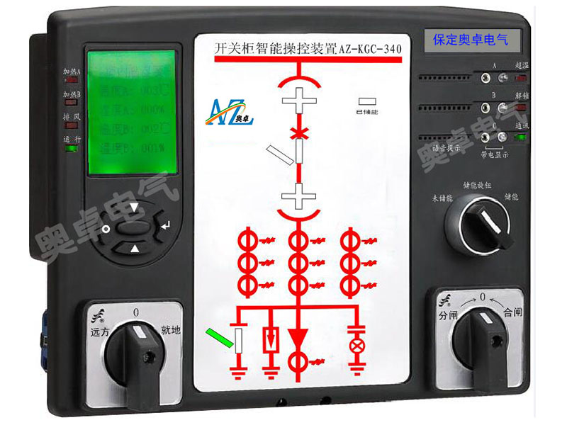保定奧卓電氣設備制造有限公司生產的AZ-KGC-340高壓開關柜智能控制裝置具有語音防誤提示+現場顯示及鎖定功能+動態模擬圖+溫濕度設定及液晶顯示+遠程/本地、開/關、儲能、照明操作功能+開/關電路完整性指示+預開/關預閃指示+人體感應探頭+電量檢測+RS485通訊接口等功能。