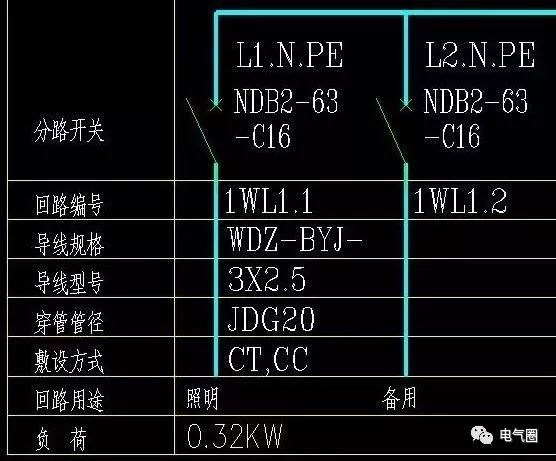 L1。并聯開關上方的N.PE表示通過從火線的三相中選擇一相,并添加零線和地線,形成一個具有220伏電源的1WL1.1回路。導線規格WDZ-BYJ-3X2.JDG20-CT,CC指低煙無鹵阻燃交聯聚乙烯絕緣(銅芯)導線,3根2.5平方毫米,直徑20毫米的金屬管,橋架及沿屋面暗敷設。同時,標記該回路用于照明和備用。照明負載為0.32千瓦,相對較小。