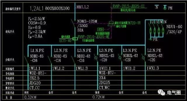 負載計算,這有點專業,但每個配電箱的圖都會有,你不需要計算,但你必須知道它的意思,這將在以后使用。每個參數的具體含義如下:Pe為額定功率,Kx為所需系數,cos為功率因數,Pjs為計算功率,Ijs為計算電流。