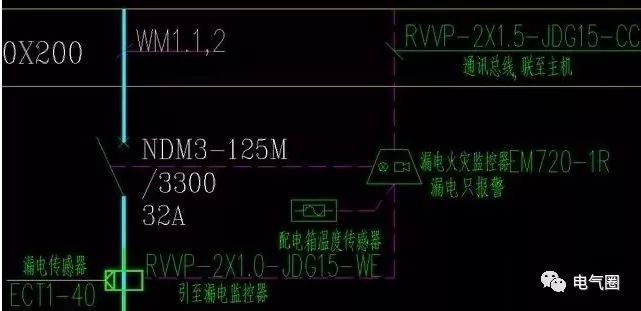 圖紙這一部分的信息量也相對較大,所以要盡量詳細。Wm1.1,2表示它由1.1環和1.2環繪制,在上層總照明配電箱;額定電流為32A的NDM125M/3300 32A斷路器;ECT40是一個電子傳感器。確切的名稱應該是剩余電流互感器。根據前面的電流計算,選擇63A或100A的剩余電流互感器就足夠了。其工作原理是檢測火線和零線(零線)的電流矢量之和,并計算電流損耗,即漏電。配電箱溫度傳感器是電氣火災監控系統中檢測配電箱箱溫度、溫度和漏電的標準箱。EM720-1R是一種電氣火災探測器,用于向電氣火災監控設備(主機)傳輸泄漏信息、溫度信息和報警信息。使用rvp-2X1.jdg 1cc,即2X1.5平方毫米屏蔽軟線,天花板中隱藏一根直徑為15毫米的金屬管。